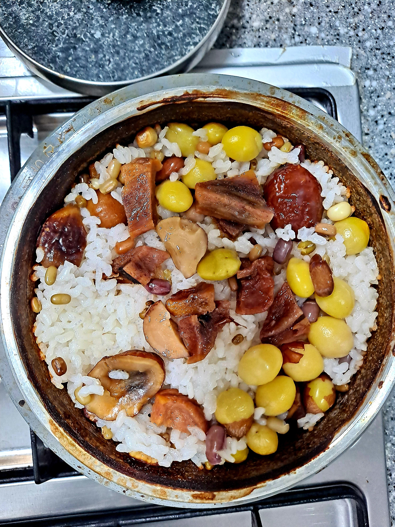 돌솥에 하얀 쌀과 잡곡 그리고 은행, 밤 그리고 곶감을 앉혔다.
