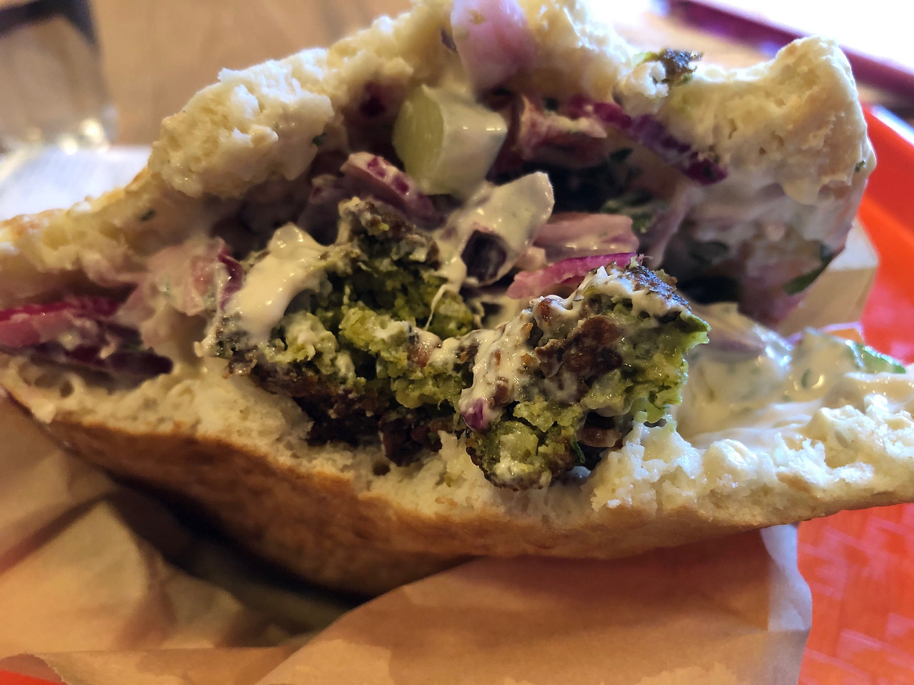 이 집의 팔라펠 샌드위치는 기대했던 만큼 맛있었다. 베어 물면 선명한 녹색이 보이는 바삭하고 담백한 팔라펠에 각종 신선한 야채 및 감칠맛 나는 소스, 폭신한 피타까지, 로컬 스타일이라기보다는 요즘 미국 스타일로 맛있게 만들어낸, 내 취향을 잘 저격하는 맛이었다. 레스토랑에서는 다양한 야채 토핑을 제공하며 vegan + 건강한 음식 느낌을 내려고 하는 것 같았는데 사실 콩 베이스라고는 해도 튀긴 음식이고, 소스가 많이 들어가서 이게 그리 건강한 음식인지는 잘 모르겠다. 하지만 분명 채식은 채식이고, 굳이 그 사실을 생각하지 않아도 가끔 먹고 싶을 만큼 맛있는 샌드위치였다.