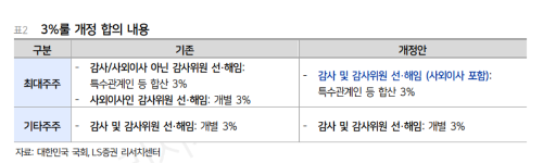 셋째, 3%룰 확대 적용 역시 아래 표를 보면 알겠지만 이미 감사와 사외이사 아닌 감사위원의 경우에는 이미 개정된 3%룰을 적용받고 있었고 금차 개정으로 사외이사인 감시위원에 대한 것만 추가된 것이기 때문에 어떤 드라마틱한 효과를 기대하는 것은 무리가 있다. 또한 감사는 주로 감시의 역할을 담당하기에 기업의 경영을 투명하게 만들 수는 있으나 경영이 투명해졌다고 반드시 주주환원으로 이어지리라는 보장도 없다.