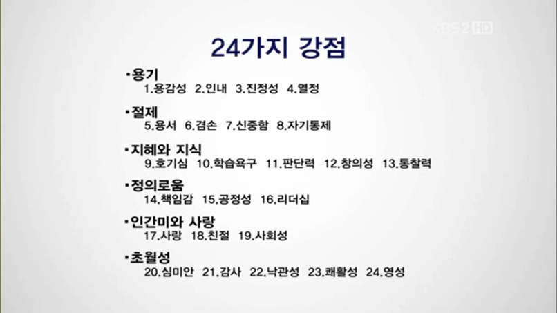 <24가지 강점:'미덕과 강점/ 성격 감정 검사의 24 항목- 나의 대표 강점을 알아보자(24가지 강점 혁명)', 김주환/ 연세대 교수>
