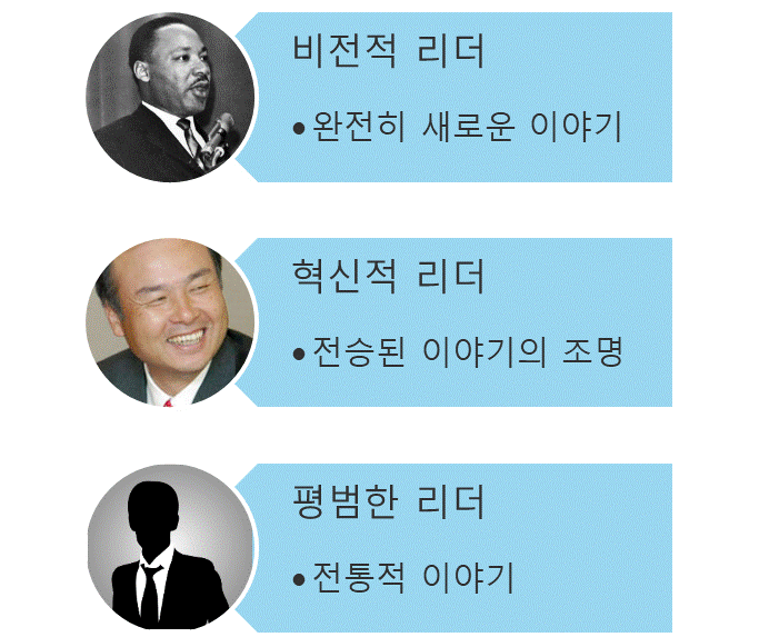 평범한 리더는 사실이니 정보를 말하지만 이것으로는 사람들에게 의미와 영감을 제공할 수 없다. 탁월한 리더는 구성원을 고무하고 공유할 수 있는 크고 원대하며 깊은 가치를 담은 이야기를 한다.