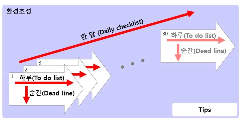 한 달간 어떤 일에 집중해야 한다면 할 일을 ‘했다, 안 했다’로만 체크해도 바로 확인할 수 있도록 작은 단위로 쪼개는 것이 필요합니다. 일종의 ‘Daily checklist’를 만드는 것입니다. 이 때 유의점은 체크리스트 항목이 3개 이내인 것이 좋다는 것입니다. 개수가 너무 많으면 주의력이 분산되어 지속하기 어렵기 때문입니다.