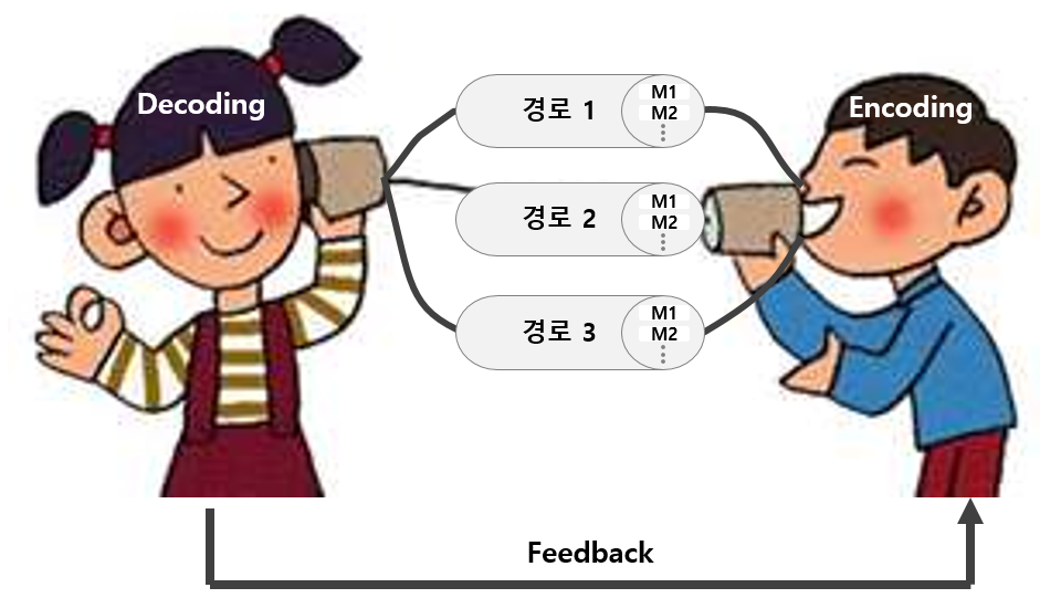 위의 그림을 보면 말을 하는 사람(화자)과 말을 듣는 사람(청자)이 있습니다. 화자는 다양한 경로를 통해 청자에게 메시지를 전달합니다. 경로는 말, 이메일, 동영상, 문자메시지, SNS 서비스, 누군가를 잠시 쳐다보기 등의 비언어적인 행동까지도 하나의 경로가 될 수 있습니다. 그리고 이 경로 안에는 전달하고 싶은 의도를 표현한 메시지가 존재합니다. 즉 화자가 선택한 메시지는 경로를 통해 청자에게 전달되는 것입니다.