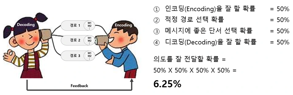 의사소통 구조의 세부 구성 항목들이 제 역할을 수행하는지의 여부에 대해 확률적으로 접근하면 조금 더 이해가 쉬워집니다. 이때 ‘확률이 몇 퍼센트인가?라는 정확성은 배제하기로 하고, 계산하기 쉽게 모든 확률을 1/2로 통일하겠습니다.