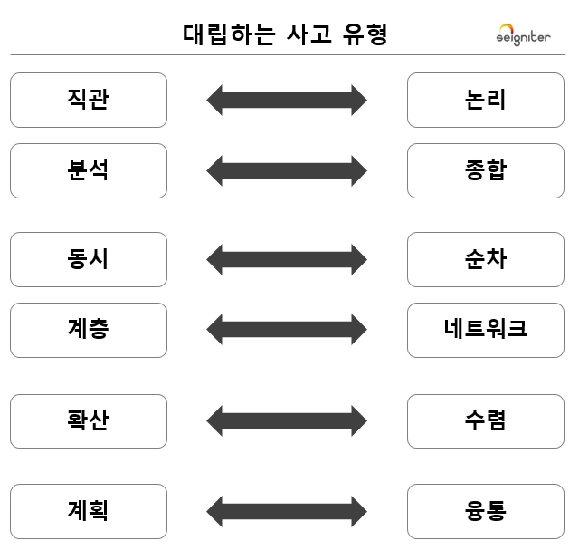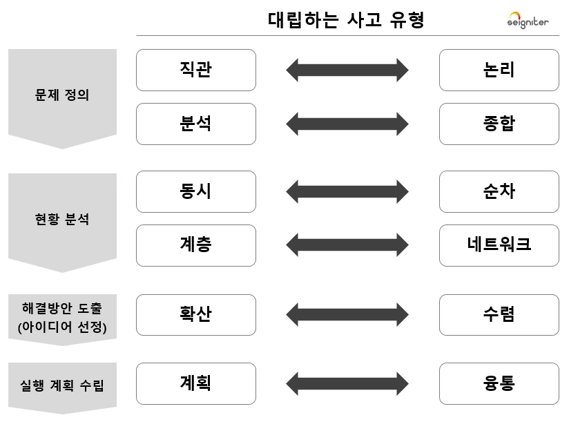 그 다음 방법은 문제해결 단계에 맞춰 다음 그림과 같이 의식적으로 대립하는 사고 유형을 매핑하는 것입니다. 한 가지 유의사항은 무조건 해당 단계에 해당 사고 유형을 접목할 필요는 없다는 점입니다. 예를 들어 현황 분석 단계에서도 얼마든지 ‘직관과 논리’ 또는 ‘분석과 종합’ 사고를 할 수 있습니다.