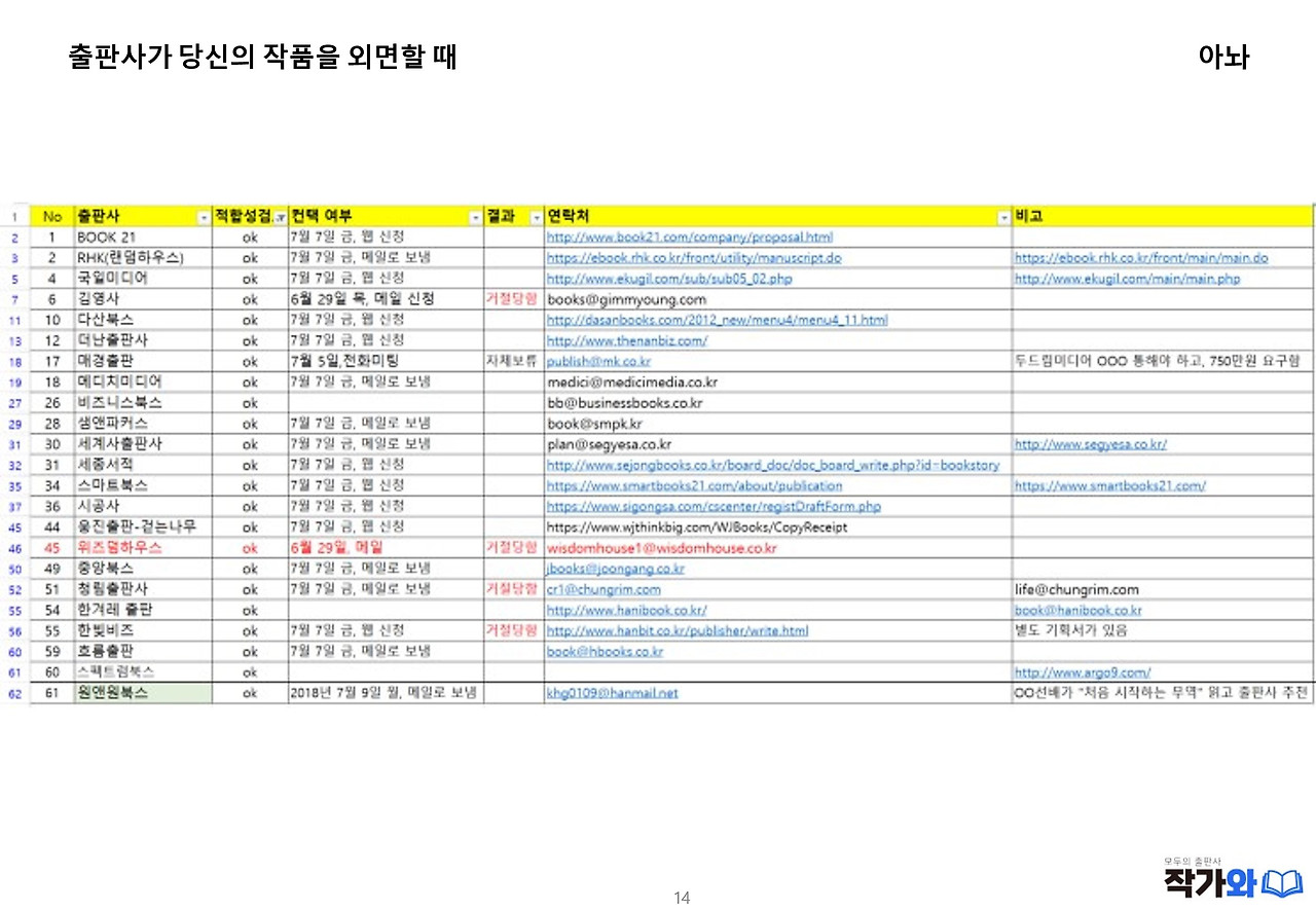그 다음 우측에 ‘컨택 여부’ 열에 뭘 쓴거냐면 우리가 연락 보내고 피드백이 어떻게 왔는지를 정리한 것이에요. 6, 김영사 행을 보시면 ‘6월 29일 메일 신청’이라고 써 있잖아요. 그게 우리가 투고한 것이죠. 그리고 바로 옆 ‘결과’ 열을 보시면 ‘거절당함’이라고 쓰여져 있죠? 말 그대로에요. 보통은 ‘작가님의 작품은 훌륭한데, 지금 저희의 출판 철학과 맞지 않아…. 아니면 지금 저희가 프로젝트가 많아 추가 책을 기획할 여력이 되지 않아…’ 이런 식으로 부드럽게 회신을 보내요. ‘너 책 별로야’ 라고요.