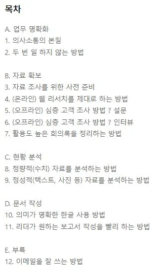 세부 목차가 업무 명확화, 자료 확보, 현황 분석, 문서 작성 이렇게 평범하게 되어 있는 것도 기존 큰 출판사의 선택을 받지 못한 이유가 되었어요. 이런 마상을 입게 되면 자연스럽게