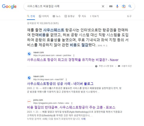 벤치마킹의 품질을 높이기 위해 어느 회사가 무엇을 잘 하고 있는지를 알면 더 도움됩니다. 위 사례에선 바로 ‘사우스웨스트의 비용 절감’이라고 주제를 특정 했는데, 사실 잘 생각해보면 사우스웨스트 항공사가 비용 절감을 잘 하고 있다는 메타 인지를 하고 있어야 챗GPT에게 바로 좋은 질문을 할 수 있기 때문입니다. 두 번째로 처음 챗 GPT가 답변한 것을 보는데서 멈추지 말고 조금 더 구체적인 질문을 하면서 바운싱 소통을 하면 어느 정도 원하는 답을 들을 수 있습니다.