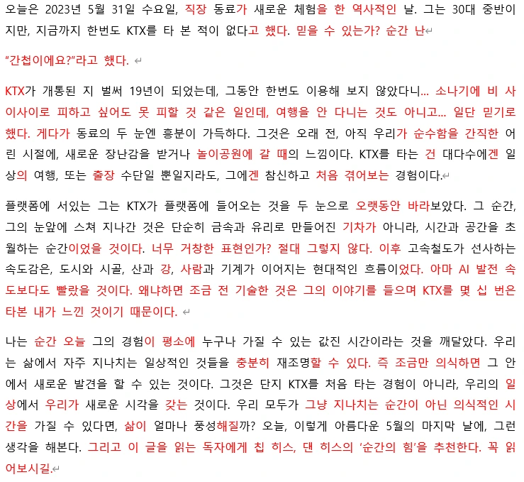 나는 순간 오늘 그의 경험이 평소에 누구나 가질 수 있는 값진 시간이라는 것을 깨달았다. 우리는 삶에서 자주 지나치는 일상적인 것들을 충분히 재조명할 수 있다. 즉 조금만 의식하면 그 안에서 새로운 발견을 할 수 있는 것이다. 그것은 단지 KTX를 처음 타는 경험이 아니라, 우리의 일상에서 우리가 새로운 시각을 갖는 것이다. 우리 모두가 그냥 지나치는 순간이 아닌 의식적인 시간을 가질 수 있다면, 삶이 얼마나 풍성해질까? 오늘, 이렇게 아름다운 5월의 마지막 날에, 그런 생각을 해본다. 그리고 이 글을 읽는 독자에게 칩 히스, 댄 히스의 ‘순간의 힘’을 추천한다. 꼭 읽어보시길.