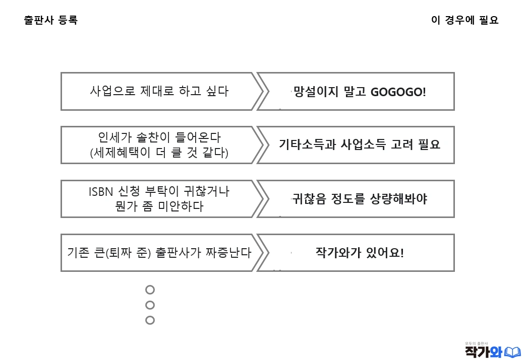 ‘나는 그냥 책 쓰고 끝내는 게 아니라 이것으로 하나의 사업을 하고 싶어’ 그렇다면 망설이지 말고 사업자 신고하고요, 개인 사업자든 법인사업자든 사업자 신고하고 출판사를 등록한 다음에 활동하시길 권합니다.