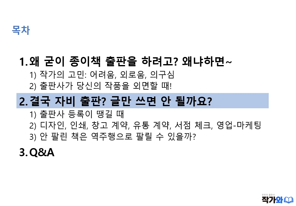 끝으로 기존에 저희처럼 김영사, 더난, 이런 데 책 내달라고 연락을 했는데 출판사로부터 다 퇴짜를 맞은 거예요. 그러면 밀려오는 짜증, 실망, 번뇌 등으로 속으로만 알파벳 I와 C를 내뱉는거죠. 이러면 이제 ‘내가 그냥 하고 만다’란 생각과 함께 어느 순간 출판사를 등록하는 내 모습을 보게 되요. 근데 지금은 대안이 있습니다. 네, 저희 작가와! 이제 막간의 홍보 아닌 홍보 같은 정말 편한 ‘작가와’가 그런 허드렛 일들을 다 대신해드린다. 이것만 기억하시면 됩니다.