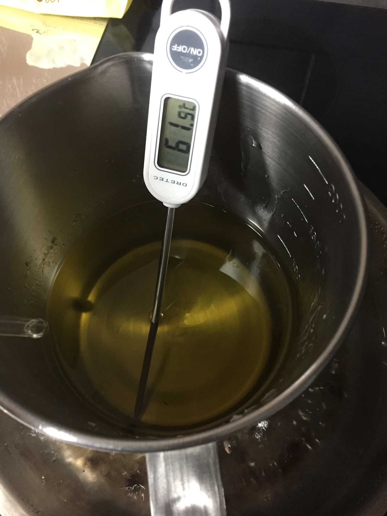 좀 더 빠르게 녹이려면 중탕하면서 계속 저어준다. 다 녹으면 향료를 계량해서 왁스에 넣어야 하는데 온도도 중요하다. 너무 높은 온도에서는 향료가 쉽게 휘발되고 너무 낮은 온도에 향료를 넣게 되면 왁스가 바로 굳어서 이쁜 모양을 낼 수 가 없다. 작년부터 몇 번의 착오 끝에 어제는 72도에 향을 첨가했다. 자체 발향이 필요한 소이 왁스 타블렛보다는 좀 적게 향료를 첨가하지만 캔들을 피우면서 향을 좀 더 잘 즐기고 싶다면 향료를 더욱 많이 첨가하여도 좋다.