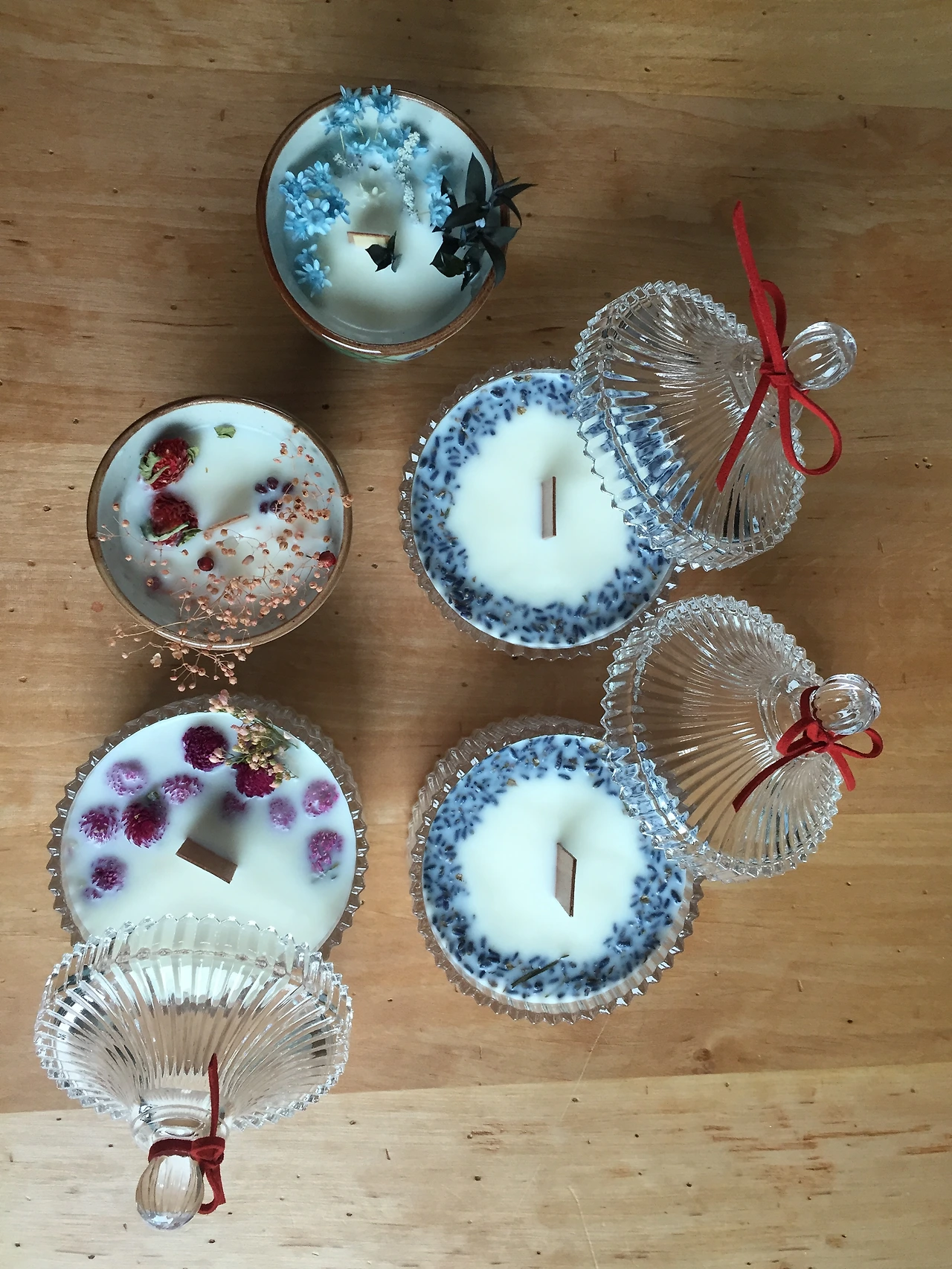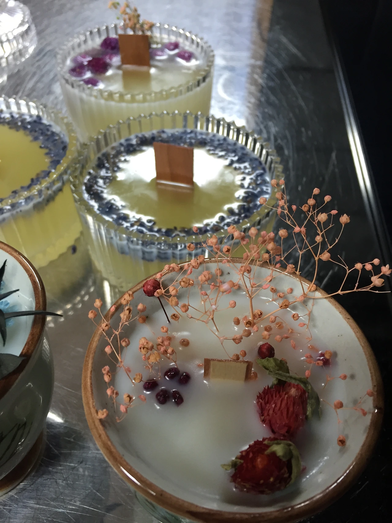 - 드라이플라워(요즘 소이캔들에도 소이 왁스 타블렛처럼 드라이플라워로 장식하는 추세다. 하지만 캔들을 켤 때 드라이플라워가 함께 타게 되면 그을음이 생길 수도 있다.)