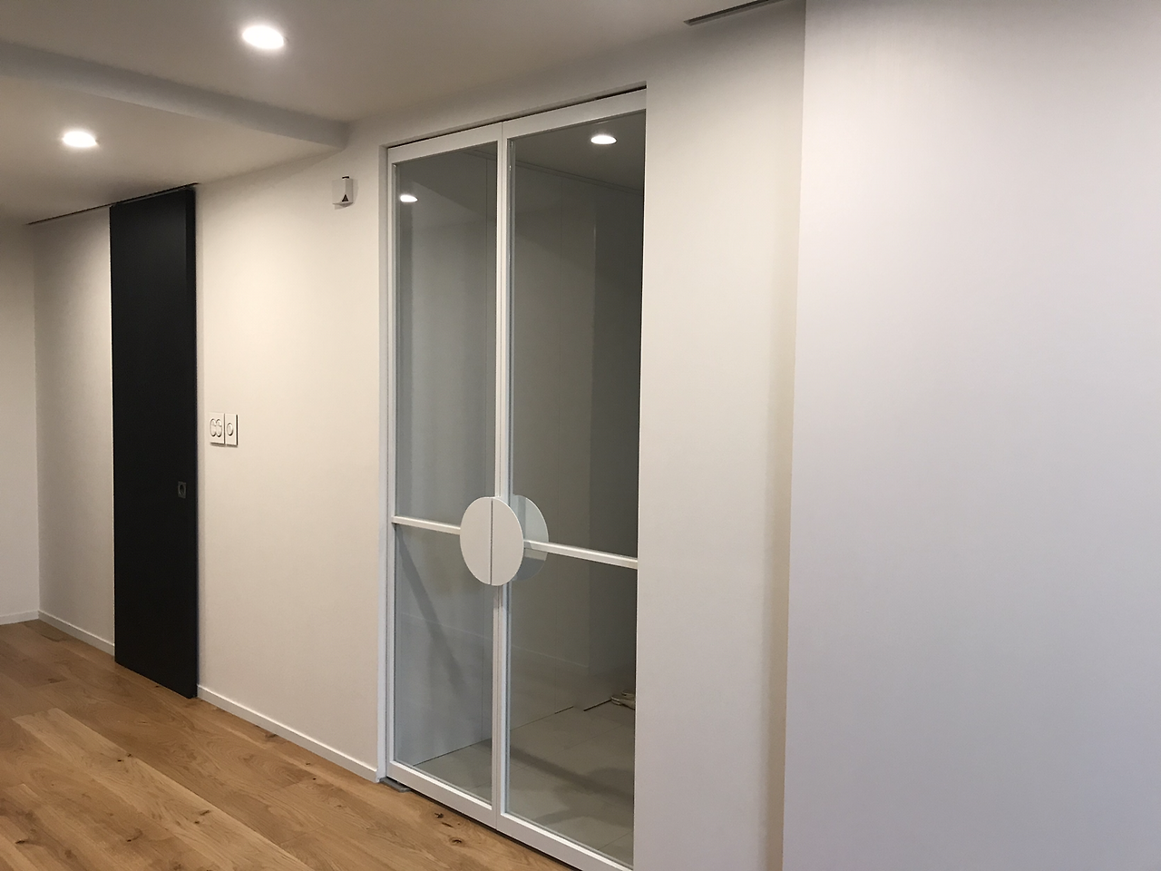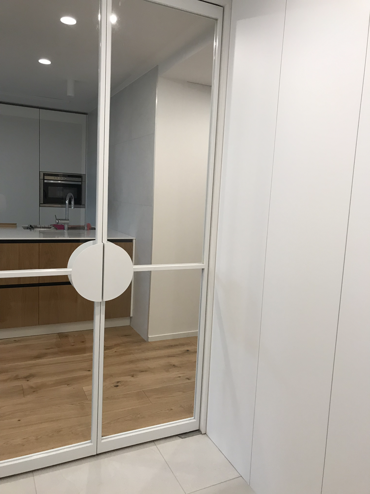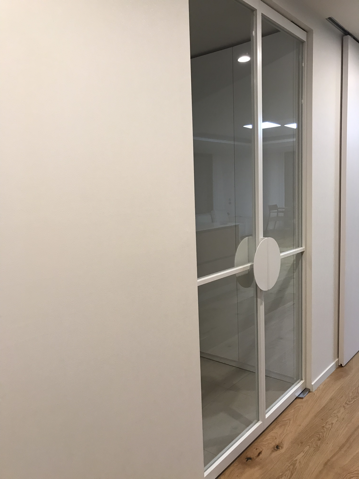 우리는 싱크대를 강조했기에 이러한 싱크대가 현관문을 열자 바로 보이도록 투명 유리로 선택했다. 대칭 양개형 문에 투명 유리. 하나의 결정이 더 남았다. 통 유리로 하느냐, 아니면 중간에 한번 나누느냐. 안전상의 문제로 중간에 한번 나눈 모양으로 선택했다.