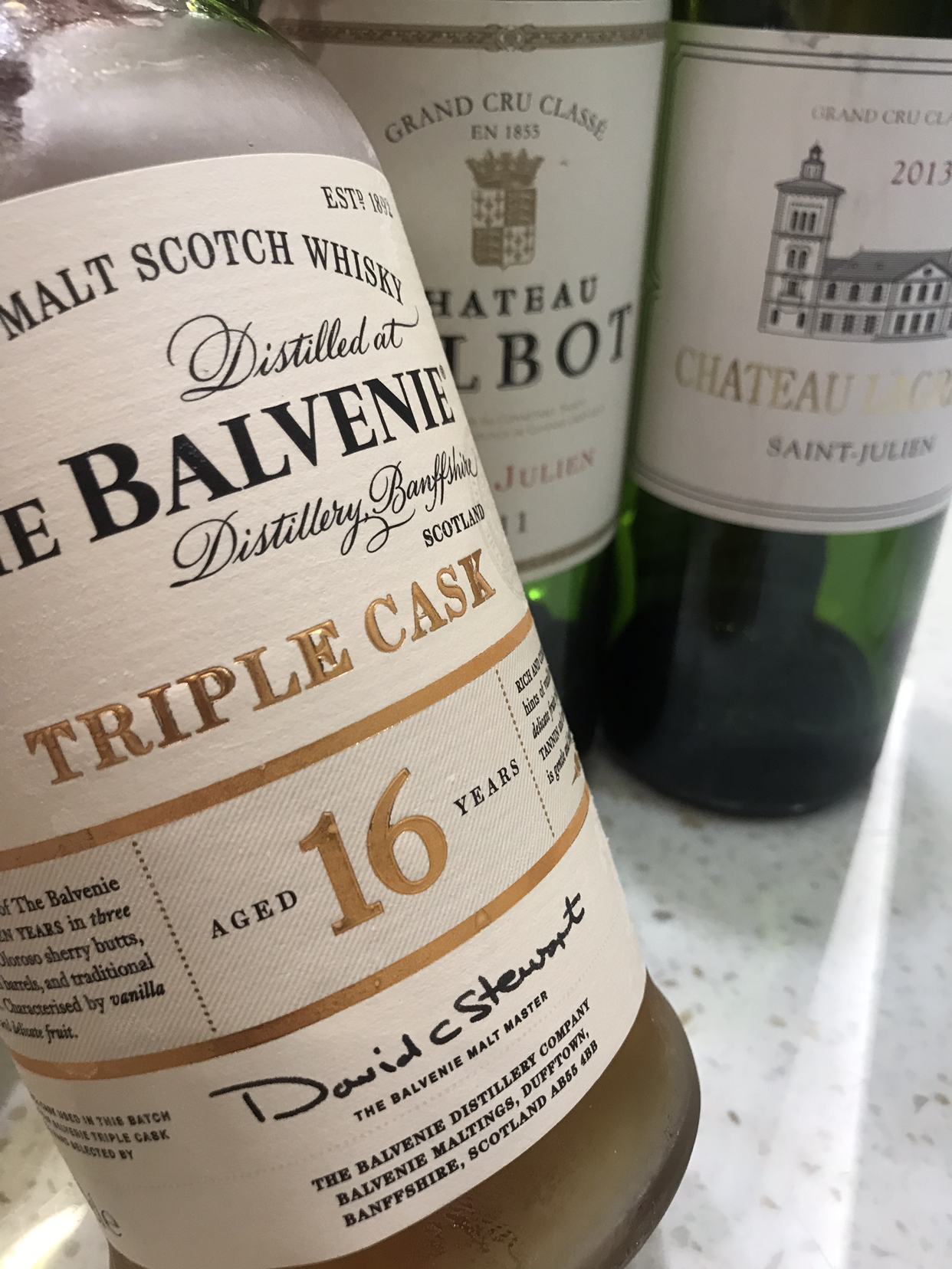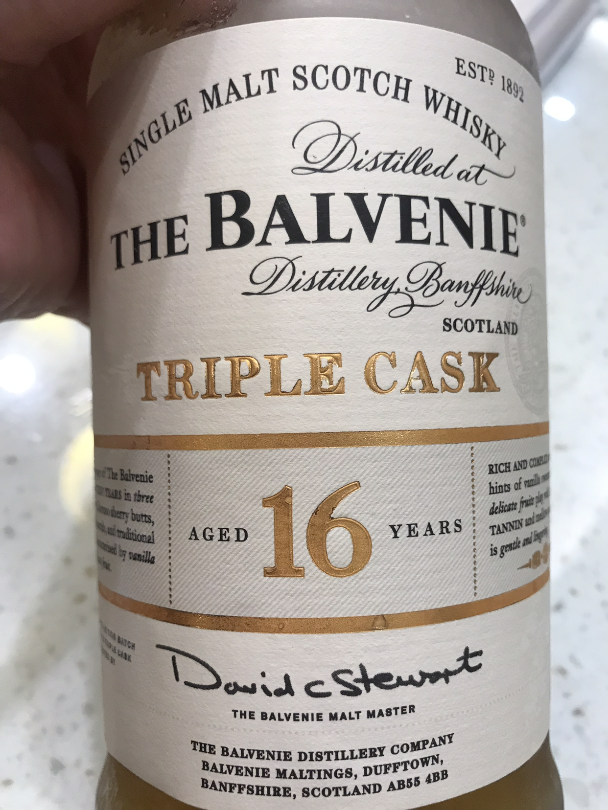 좀 더 자세히 살펴보자. 발베니 트리플 캐스크 16년 병을 살펴보면 16년 아래쪽에 사인이 하나 있다. 데이비드 스튜어트 몰트 마스터의 사인이다. 데이비드 스튜어트 몰트 마스터가 직접 3가지 퍼스트필 버번, 리필 버번, 셰리 원액을 선택하고 이를 오크통에 담아서 6개월간 숙성과 안정화 작업을 거쳐서 만든 것이다.