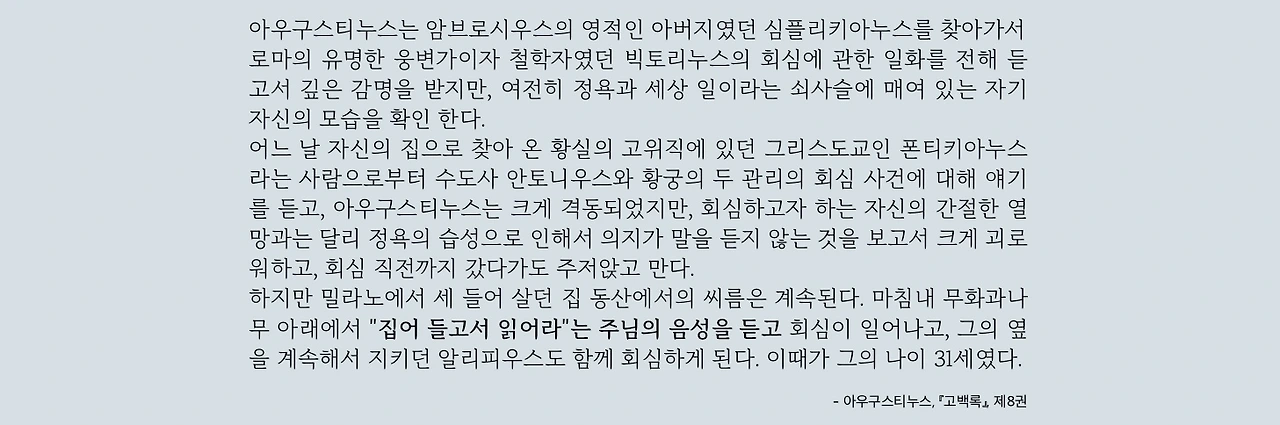 아우구스티누스는 『고백록』 제8권에서, 정원에서 들은 “Tolle, lege(집어 들고 읽어라)”라는 한마디가 자신의 삶을 근본적으로 바꾸는 계기가 되었다고 기록한다.