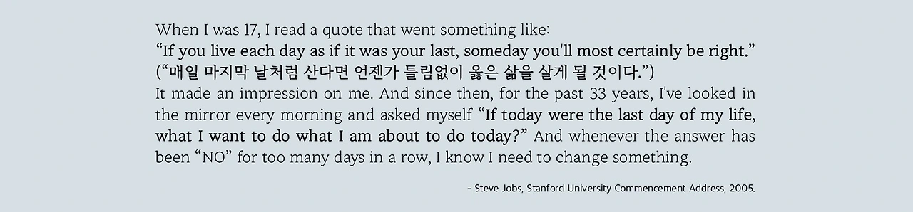 스티브잡스는 스탠퍼드 졸업 연설에서 17세에 ‘매일 마지막 날처럼 산다면 언젠가 틀림없이 옳은 삶을 살게 될 것이다.‘는 말 한마디에 감명을 받았고 그 이후 매일 아침 ‘오늘이 내 인생에 마지막 날이라면 나는 오늘 무얼하려고 할까?’라고 물었다고 한다.