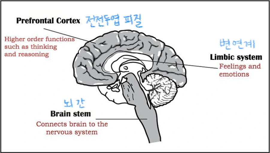 뇌는 크게 뇌간-변연계-피질 3단계로 구분하는데, 중심부에서 바깥쪽으로 나올수록 뇌는 원시적이고 기본적인 기능에서 섬세하고 고차원적인 기능을 담당하게 된다.