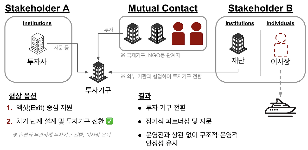 실제로는 수많은 액션 플랜과 숫자, 이해관계자 설계가 담긴 두세 권 분량의 전략이었지만, 극단적으로 줄이면 이 두 가지 선택지로 정리할 수 있었다. 표면적으로 보면 두 가지는 전혀 다른 선택지처럼 보이지만, 재단 이사장의 입장에서는 본질적으로는 같은 질문을 다른 언어로 던진 것이었다. 그의 은퇴라는 결심을 바꿀 수는 없다, 그렇다면 당신은 당신이 평생을 바쳐 일군 이 혁신의 이코시스템에 어떤 레거시를 남길 것인가 즉, 어떻게 ‘끝낼 것인가’ 혹은 어떻게 ‘이어갈 것인가’. 그리고 나의 입장에서도 이후 단계에서도 내가 할 일은 동일했다, 방식과 접근법은 다르겠지만 A와 B옵션 모두 투자기구로 전환하는 것을 목표로 가지고 있었다.