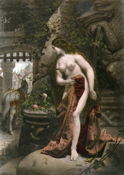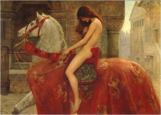 시종들의 눈물 속에 고디바는 알몸으로 말에 올랐다.
