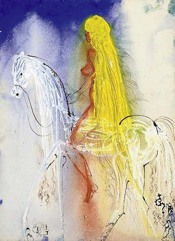 고개를 숙인 채 알몸으로 말을 타고 있는 여인.