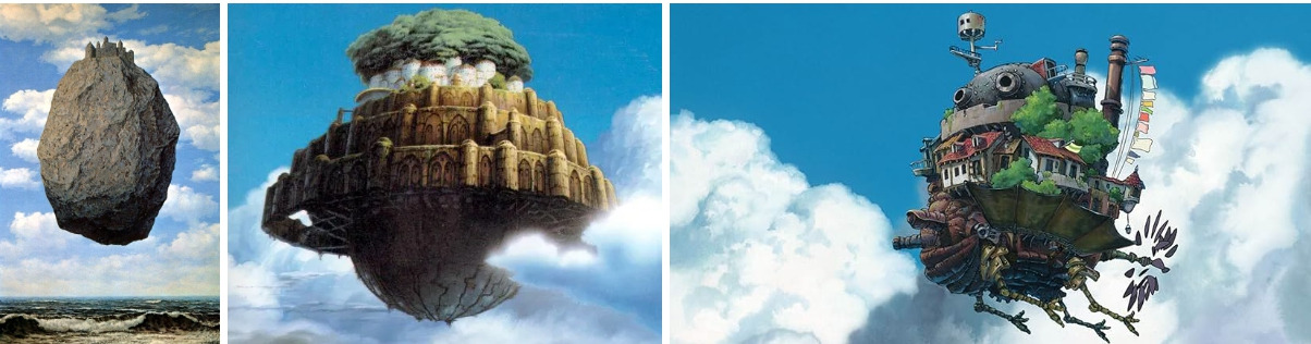 또한 마그리트의 작품 <피레네의 성>은 천공의 섬 라퓨타와 하울의 움직이는 성의 모티브가 되었다.