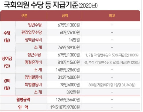 연봉과 각종 수당, 지원금 등 그리고 보좌진 운영비용을