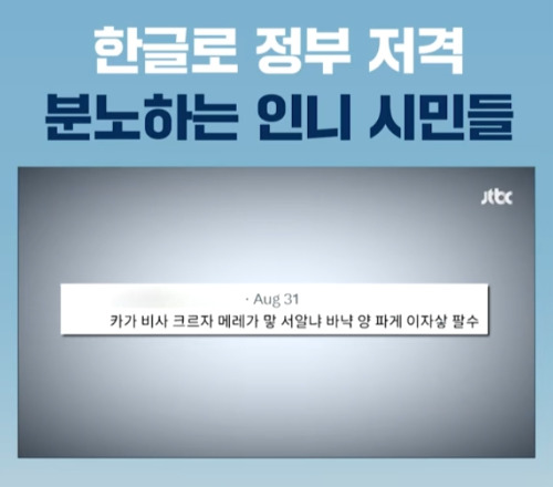 한글로 자국어를 음차하여 항의 의사를 표현하는 모습은