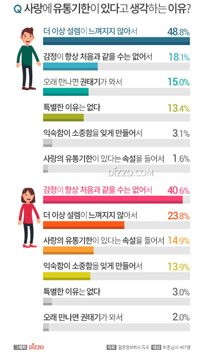 여성 47%는 '감정이 항상 처음과 같을 수는 없어서'를 이유로 꼽았다.
