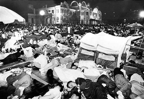 사람들은 돗자리나 신문지를 깔고 이틀 밤을 새우며 표를 기다렸다.