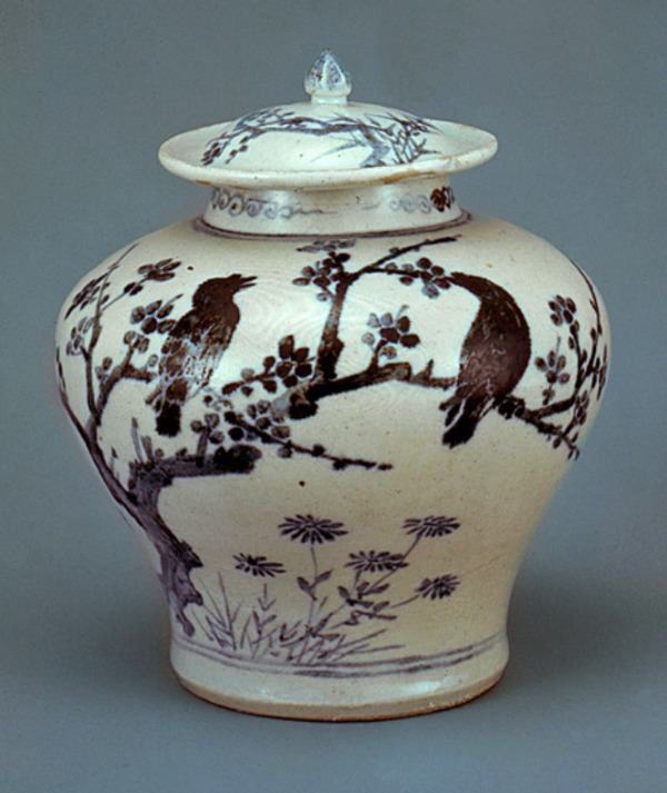 국보 제170호 청화매조죽문 유개항아리는 매화와 대나무를 푸른 안료로 그려낸 작품으로