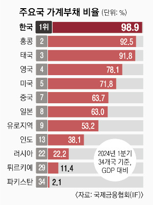 먼저 한국의 가계 부채는 2025년 1분기 기준 GDP 대비 89.4%로 주요국 중 최고 수준이며,