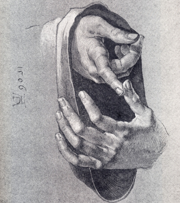 <기도하는 손>은 사실 후원자를 위한 교회 제단화의 예비 스케치 중 하나였으며,