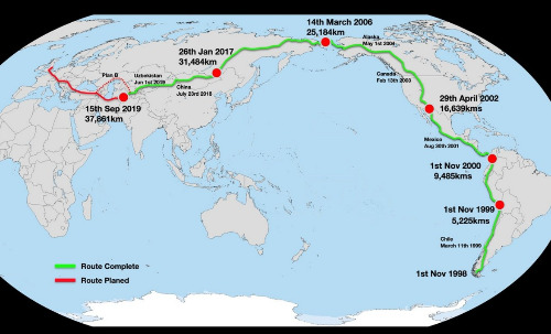 그는 58,000킬로미터의 여정을 완전히 도보로만 완주하려 한다.