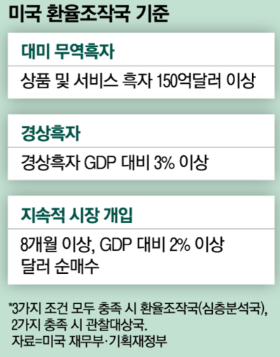 대미 무역 흑자, 경상수지 흑자 등 미국 재무부가 내건 세 가지 기준 중