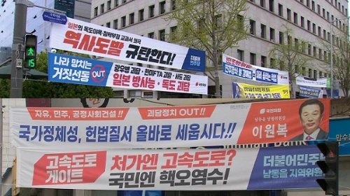 집 앞의 횡단보도에는 오늘도 어김없이 정치 선동 현수막이 걸려져 있다.