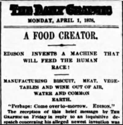 1878년, 뉴욕 그래픽 신문은 에디슨이 흙을 식량으로 바꾸는 기계를 발명했다고 보도했다.