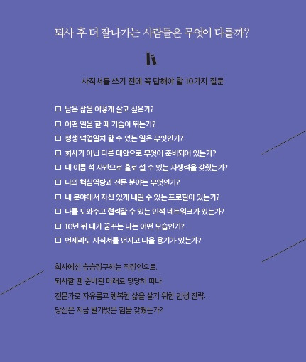 ‘사직서를 쓰기 전에 꼭 답해야 할 10가지 질문’이 있다. 교과서 내용이 아닌, 나의 실제 경험을 토대로 만든 질문들이다. 사직서를 가슴에 품고 사는 분은 이 질문들에 답을 해본 후 사직서를 낼 것인지 여부를 결정하면 어떨까 한다. 그렇다면 나의 답은 어땠을까?