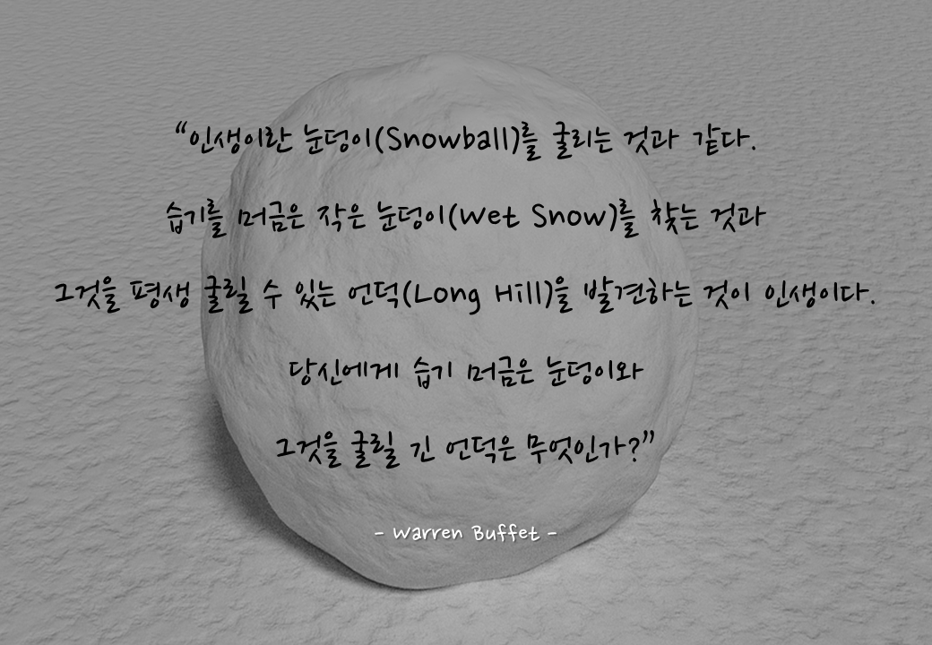 투자의 귀재, 워런 버핏(Warren Buffet)은“인생이란 눈덩이(Snowball)를 굴리는 것과 같다. 습기를 머금은 작은 눈덩이(Wet Snow)를 찾는 것과 그것을 평생 굴릴 수 있는 언덕(Long Hill)을 발견하는 것이 인생이다. 당신에게 습기 머금은 눈덩이와 그것을 굴릴 긴 언덕은 무엇인가?”라고 말했다.
