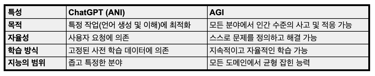 • 한계: 기술적, 윤리적 과제와 자원적 한계로 인해 완전한 AGI 구현은 아직 실현되지 않았습니다.