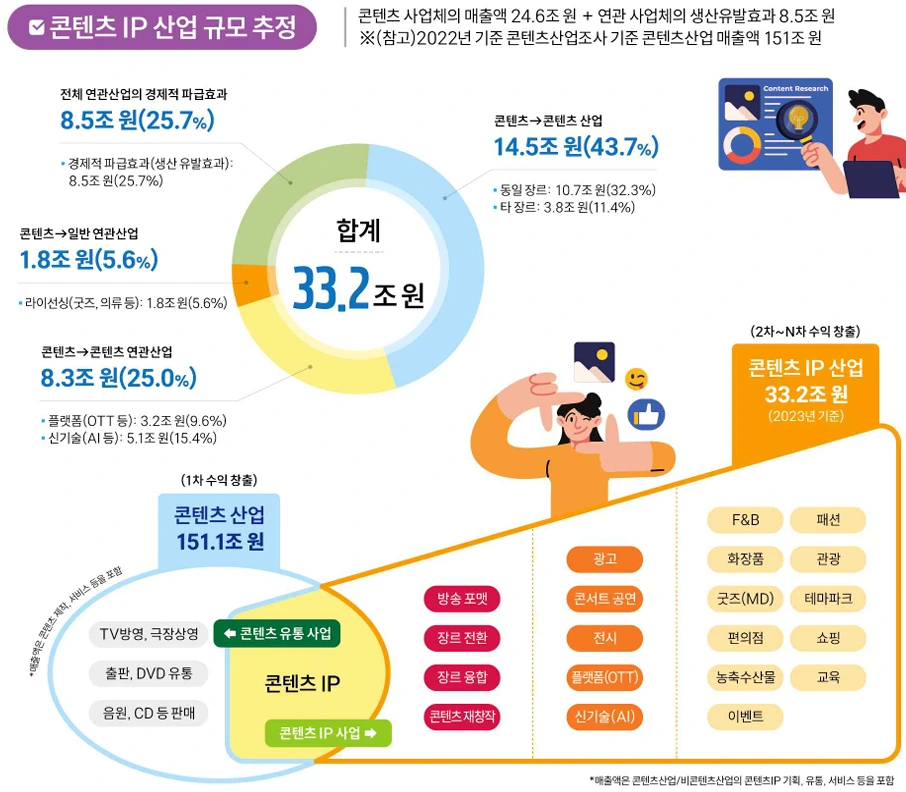 조사 결과 한국의 콘텐츠IP산업 규모는 2023년 기준 33.2조 원으로 추정되었다. 콘텐츠산업 내 콘텐츠IP 활용 확장산업 규모가 24.6조 원, 콘텐츠산업 외 분야 규모는 8.5조 원*이다. 네 번째 글에서 언급했듯이 성공적인 IP 비즈니스는 콘텐츠 수익보다 그 외 수익이 더 커져야 한다. 한국이 콘텐츠 사업 대비 IP 사업 수익이 작은 것은 이 조사를 통해도 확인할 수 있었다.
