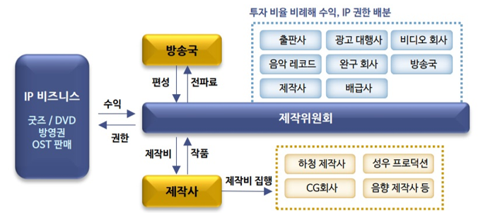이처럼 조직의 성격이 문화산업전문회사는 단발성, 제작위원회는 지속성 및 확장성이다 보니, 전자SPC가 해산되면 IP 권리가 소멸되거나 제작사에 환원되어 지속적인 IP 비즈니스가 어렵다. 반면, 후자참여사별로 나눠가진 권리를 가지고 각자의 전문 사업 영역에서 수익을 창출해낸다.