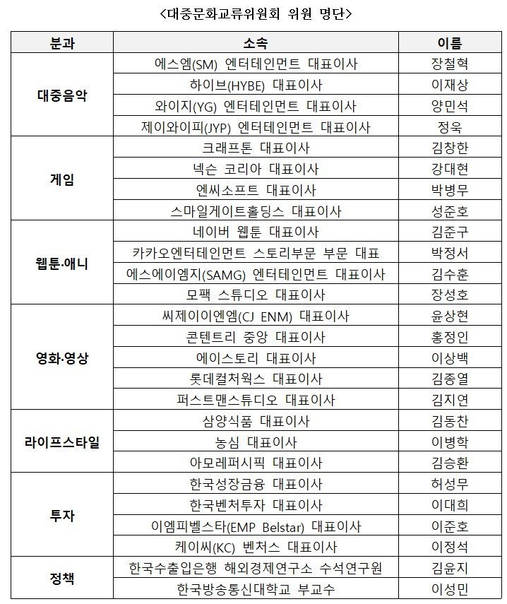 문화체육관광부,「대중문화교류위원회 7개 분과 민간 위원 26인 발표」, 2025.