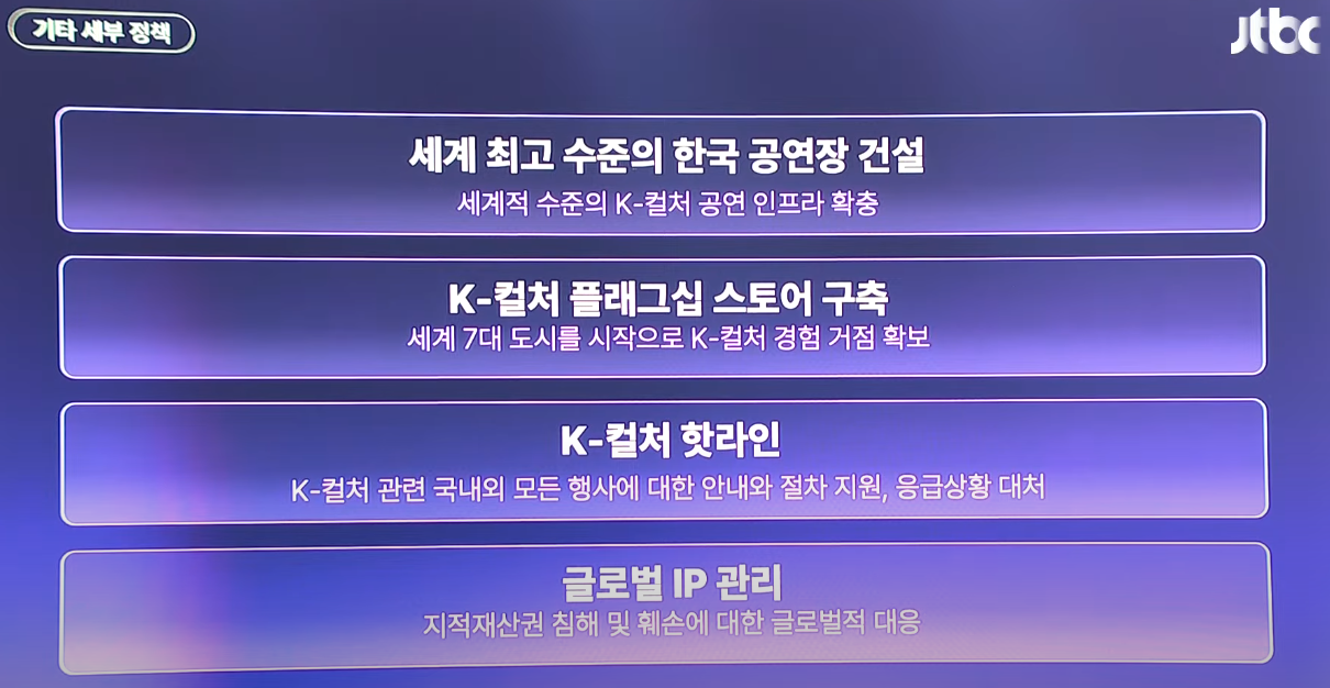 지금까지 살펴본 두가지 핵심 계획 외에도 해외 어디서든 K-컬처 관련 행사를 개최할 때 도움을 주는 원스톱 서비스인 'K-컬처 핫라인' 운영이나, 아티스트와 창작자의 피와 땀이 담긴 K-컬처의 소중한 자산을 불법 복제와 무단 사용으로부터 보호하기 위한 '글로벌 IP 관리' 같은 아젠다도 있다. K-컬처 열풍이 해외에서 지속가능하기 위한 중요한 기반인 만큼 이런 영역도 신경을 쓰는 것은 중요한 것 같다.