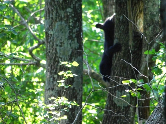 부인의 자세로 보아 뭔가 큼직한 것을 발견한 것으로 판단하고 그녀에게 조심스레 갔더니 숲 속을 가리키며 검은 곰이 있다고 알려주었다. 어두워서 금세 적응이 안되었으나 차츰 시력을 찾았으며 아무리 살펴도 보이지 않기에 언덕을 내려가 풀밭에 앉아서 살피니 큰 나무 아래서 엄마곰이 뒹굴고 있었고 새끼곰 두 마리는 나무 위로 쏜살같이 오르고 내려오기를 반복하였다.