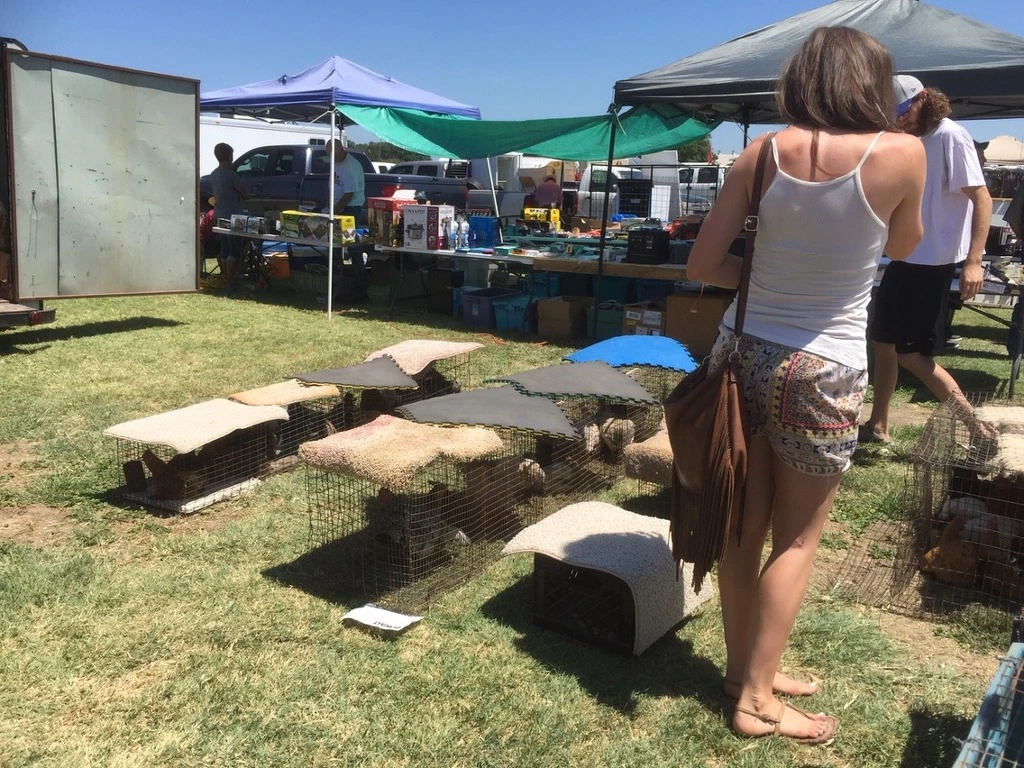 각종 장닭이 잔디에 놓어져 있으며 주인은 햇볕을 가리 주기 위해 카펫을 얹어놓았고 뒤태가 아름다운 여인과 남자 친구는 부스마다 유심히 살피며 다닌다.