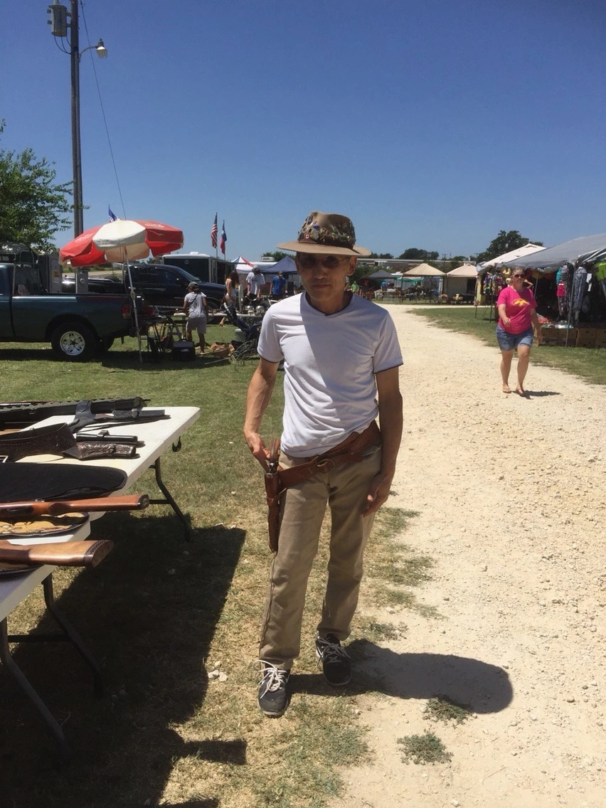 서부시대를 살아가던 카우보이의 거친 모습과 똑같은 주인에게 양해를 구하고 그들이 차고 다녔던 권총 탄띠를 허리에 묶어보는데 넓은 가죽 허리띠가 분간이 잘 안되어 헤매었다. 총잡이 권총 띠는 허벅다리에 권총에 놓이도록 차야 권총을 빠르게 뽑아 쏠 수 있으므로 사진의 모습처럼 비스듬히 매는 것이고 무릎 바로 위에 권총 지갑 아래에 늘어진 가죽끈을 다리에 묶어서 흔들리지 않도록 고정해야 한다.