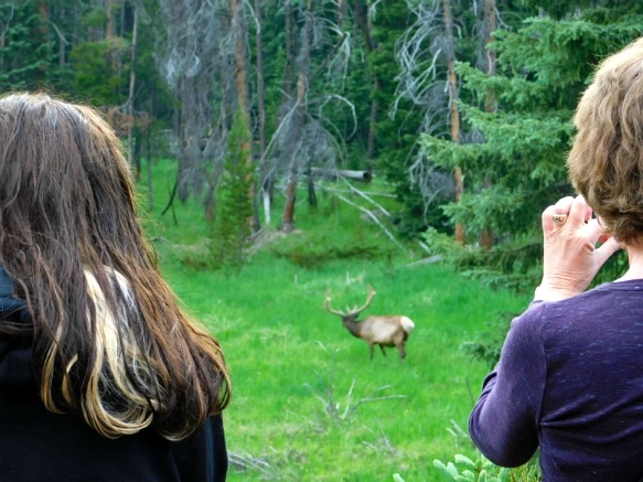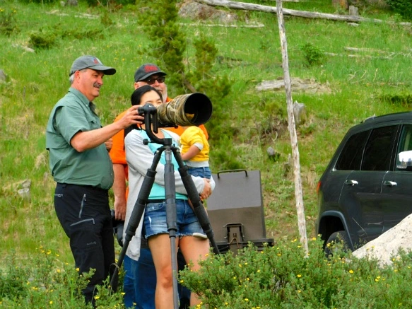 대물망원경 카메라로 사진을 찍던 이들이 중국인 관광객이 질문하니 카메라로 사슴의 무리를 보여주고 있다.