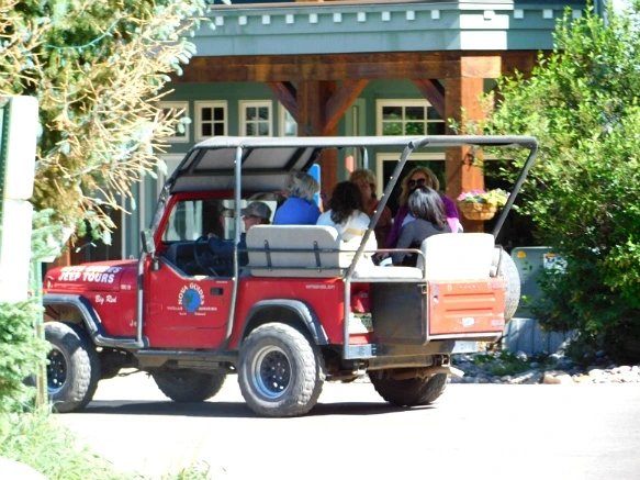 지프로 관광객을 태우고 계곡으로 들어가는 차량........