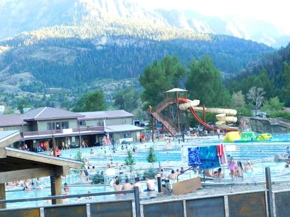 어레이 마을에 들어서니 대규모 온천 사인이 있고 수영장에는 인파가 가득히 붐볐다.